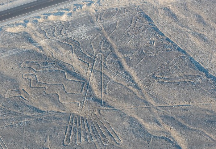 Las Líneas de Nazca, llamadas así desde su descubrimiento en 1927, son el vestigio más increíble jamás dejado por una cultura forjada 300 años antes de la era cristiana. Se trata de geoglifos y trazos rectilíneos dibujados a base de surcos de 20 centímetros de profundidad que forman imágenes zoomorfas y fitomorfas de casi 500 metros de longitud. Representan aves de hasta 275 metros de largo, colibríes gigantes, cóndores, la garza, la grulla, el pelícano, la gaviota, el loro, un mono, una araña, un caracol, una lagartija, una ballena de 27 metros, un perro con patas y cola largas, dos llamas…