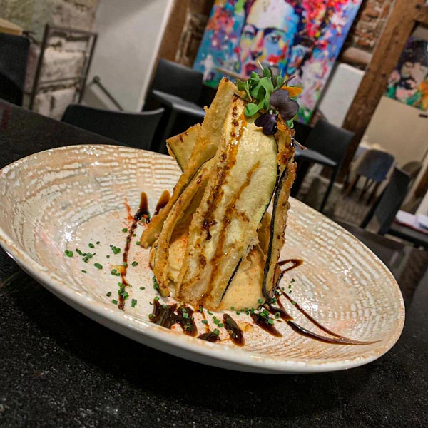 Para el delivery Arrabal propone: berenjenas en tempura sobre una cama de hummus y miel de caña, ensaladilla con sus camaroncitos fritos y anchoas 00 de Santoña con tomate triturado y panecillos, entre los entrantes. Algunos principales como el cochinillo confitado en su jugo y cremoso de patata trufada,  salmón noruego en papillote de verduras o cachopo de solomillo de ternera con queso de cabra y cecina. Entre los postres, crema catalana con caramelo y fresa en lámina, sorbete de mango con gotas de champagne y tarta cremosa de chocolate.