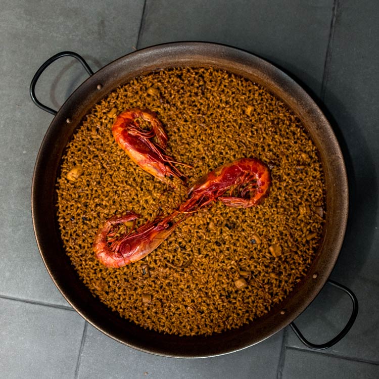 Además de la oferta de arroces, con precios por ración desde los 12 € recogida en local y 13,50 € a domicilio; ofrecen una pequeña selección de vinos y un par de entrantes: ensaladilla rusa y cremosas croquetas de jamón ibérico.