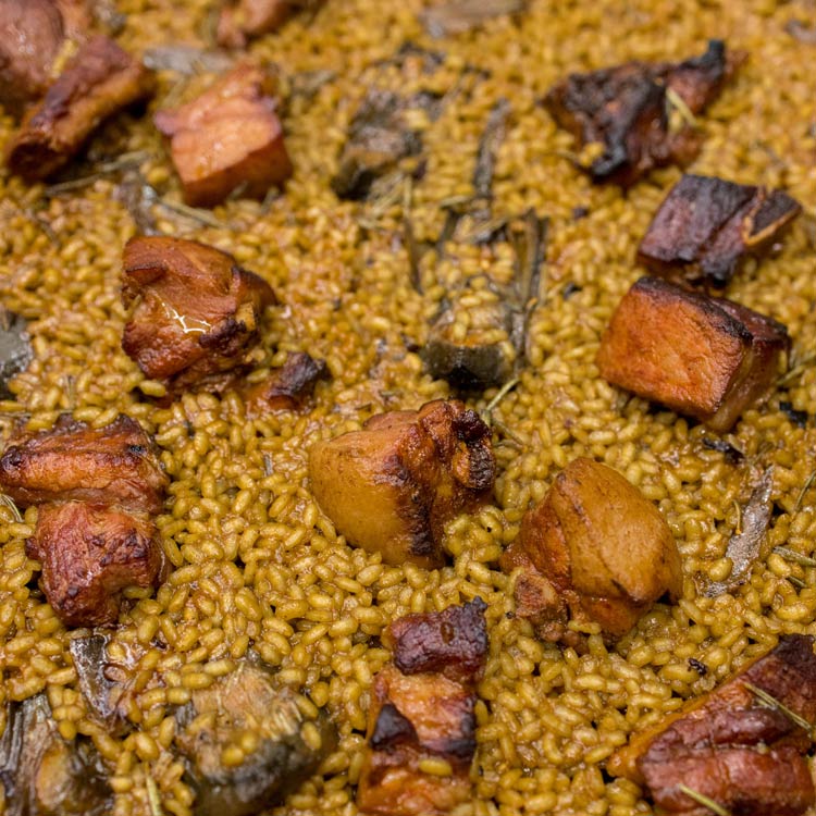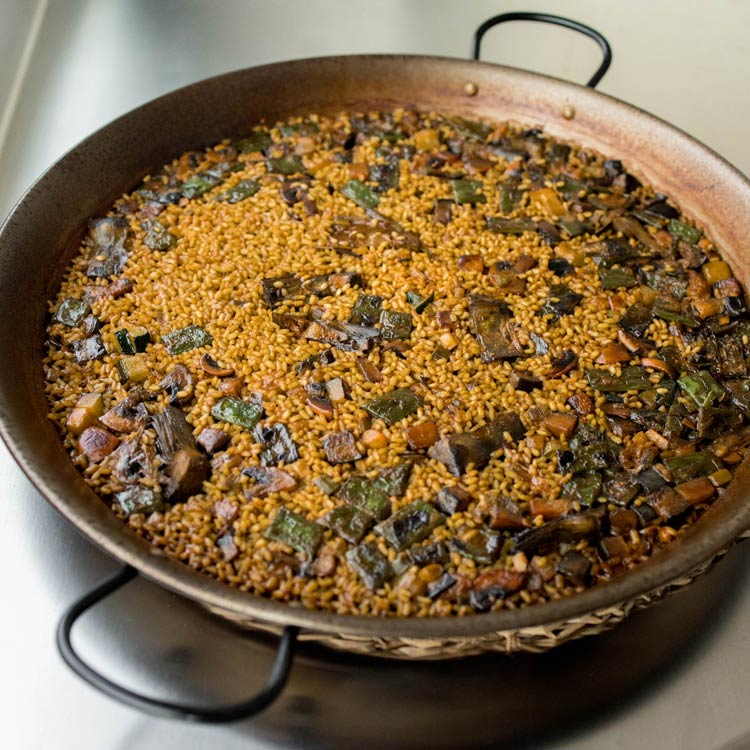 Lo que el huerto ofrece en cada temporada acompañado de un arroz bomba exclusivo cocinado con caldo de jamón