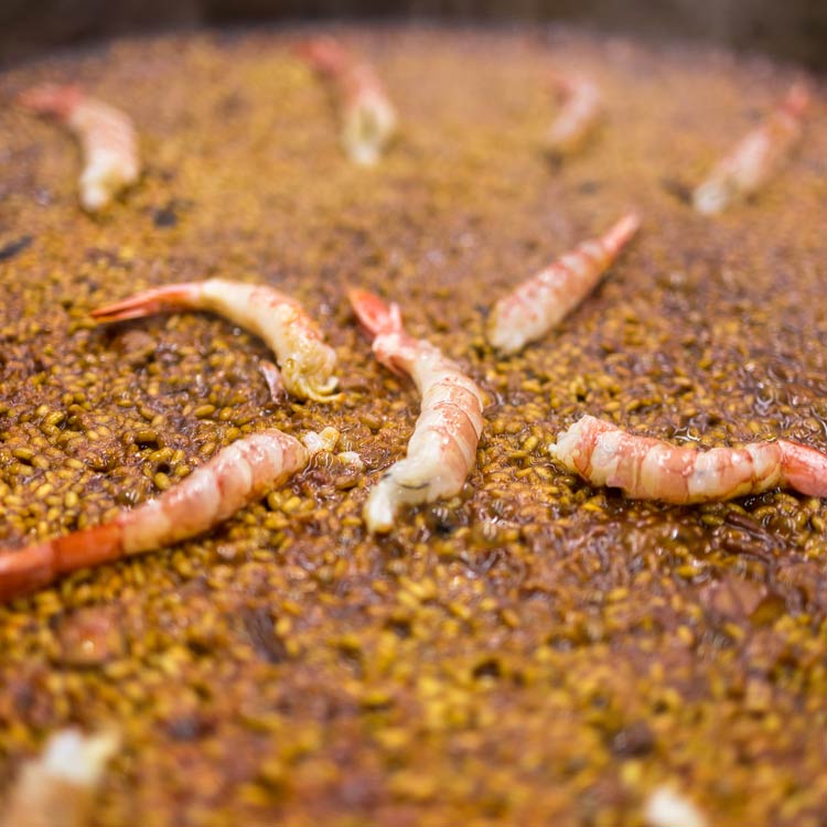 Arroz bomba de las marismas de Levante, calamares, gambitas peladas y todo ello regado con un fondo de marisco