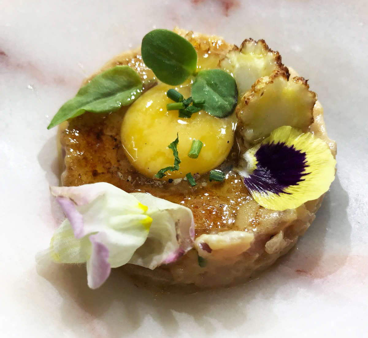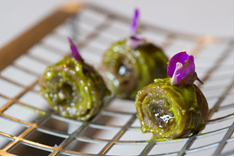 No podemos dejar de nombrar este plato por estar protagonizado por uno de los productos más icónicos de Cantabria: Anchoa, pistachos, confitura y flor