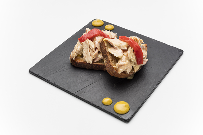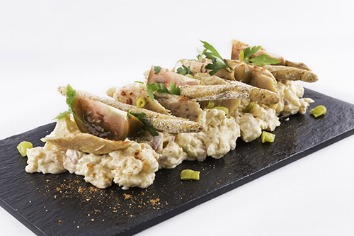 El chef Pedro Noriega es un enamorado de los pescados “de aquí”, por eso el bonito, los bocartes y las anchoas están presentes en muchas de sus recetas. Ejemplo de ello son la Ensaladilla rusa con ventresca de bonito o el Gofre de hojaldre, berenjena asada bocartes, olivas negras y salsa romescu