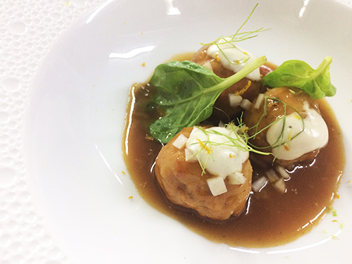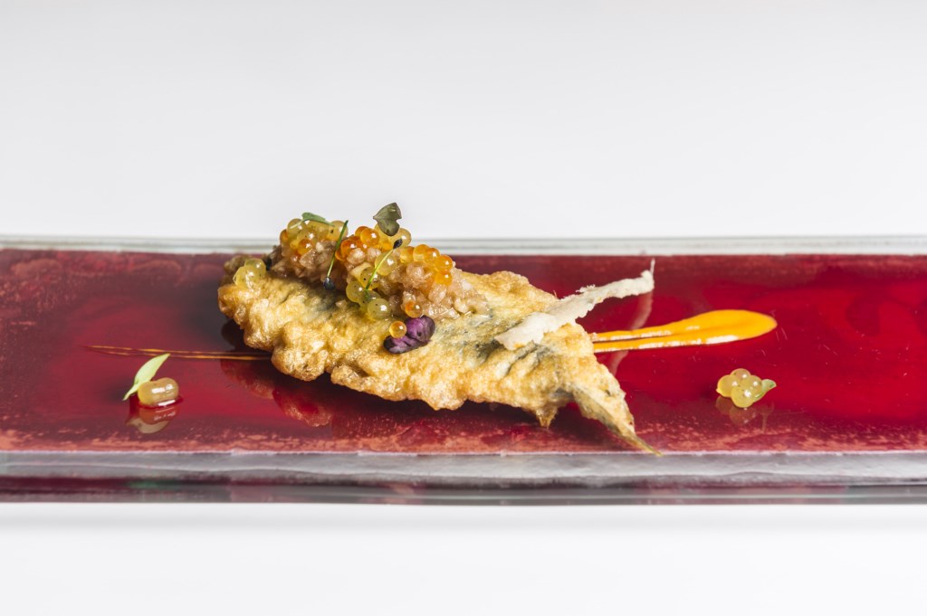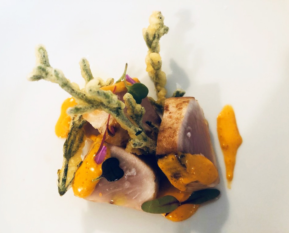 Bruno Lombán propone un Bonito escabechado al momento (bonito al punto con emulsión de escabeche de verduras templado y tempura de alga codium)