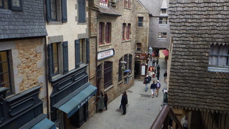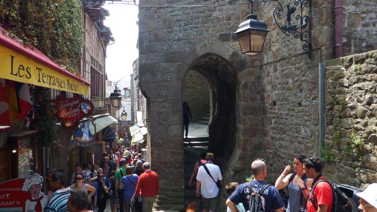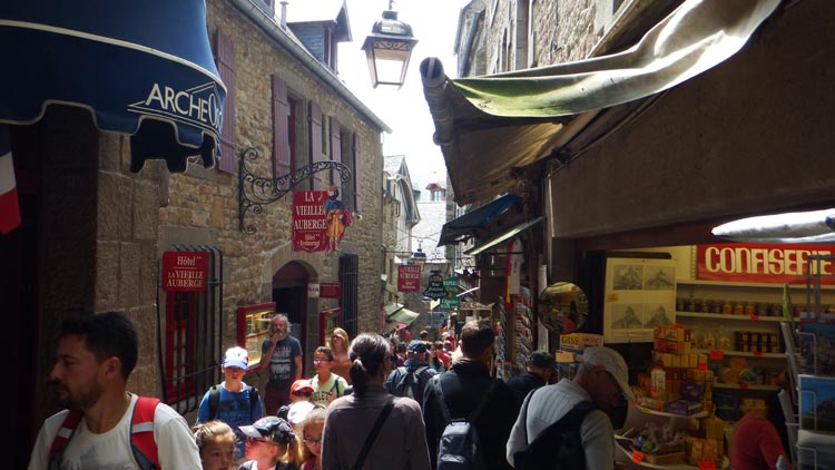 En la explanada que precede a la puerta principal de acceso, una señora de apariencia filipina nos pide que le hagamos una foto delante de un carruaje para turistas tirado por caballos. Los equinos son estupendos, y ella queda la mar de encantada con su foto, pero es justo detrás donde comienza el espectáculo. Desde aquí, la vertiginosa verticalidad del lugar, rematada por el pináculo de la abadía, arranca los primeros gestos de asombro. Nunca deja de sorprender el talento inmenso del estamento monacal para levantar sus reductos de oración y estudio en los lugares más remotos e insospechados. Estamos frente a un portentoso ejemplo. Existe algo de reverencial en pisar por primera vez un lugar que llevabas toda la vida deseando conocer, en caminar por esta calle principal que serpentea las faldas del monte y por su afluente de callejuelas. A poco que la imaginación funcione, sobrecoge evocar sus calles hace siglos, medievales y silenciosas, recorridas solo por frailes y pescadores. Pero la realidad es terca y, ya desde los primeros pasos, te devuelve al presente de esta Grande Rue infestada de restaurantes, hoteles, confiterías y tiendas de souvenirs. Sí, el vacilo del más descarado mercadeo se enseñorea de este lugar desde hace tiempo, aunque parece ser que ya durante la Edad Media, cuando el monte era un importante punto de peregrinaje, aquí se vendían souvenirs.
