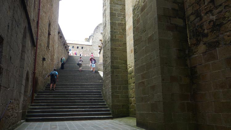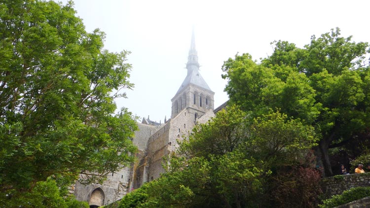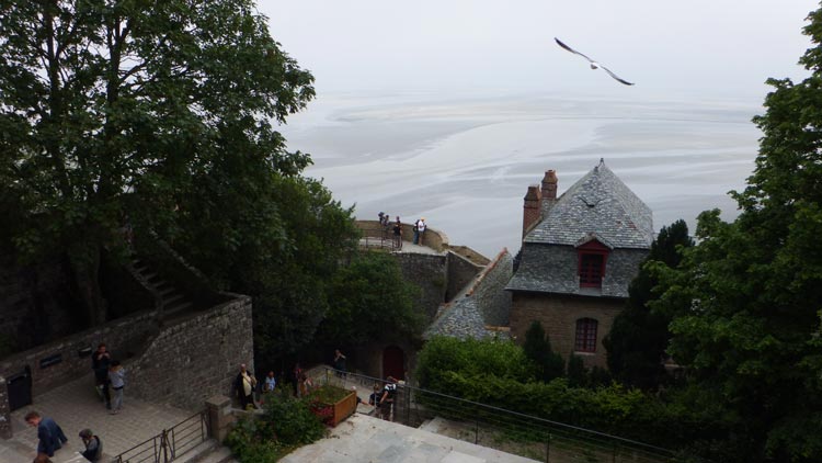 Hay que hacer solo un pequeño esfuerzo de abstracción, dejando de lado ese elemento de invasión turística, para conseguir apreciar la belleza tan especial de este lugar. Victor Hugo dijo que el Mont Saint-Michel era para Francia lo que la Gran Pirámide era para Egipto. Supongo que es cuestión de gustos, pero intuyo que bajo las palabras del escritor francés se esconde una cierta verdad. Según asciendes hacia la abadía, que ocupa el colofón del monte, el gentío se dispersa y la tranquilidad, condición indispensable de la contemplación, va en aumento. Hoy el día ha amanecido luminoso, pero en jornadas más oscuras la apariencia del cenobio debe ser fantasmagórica, casi amenazadora. Cada vez es menor el murmullo humano que pronto se ve sustituido por la banda sonora, más acorde con decorado tan solemne, del graznido de cuervos y gaviotas, el trino de otros pajarillos y la melodía del viento inundándolo todo.