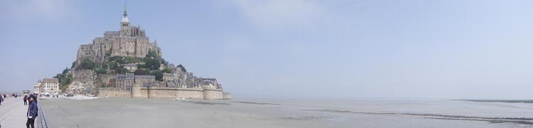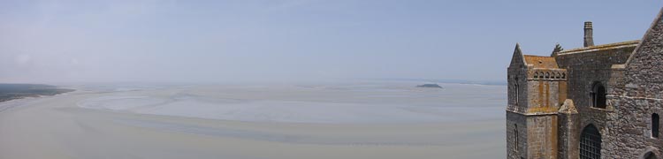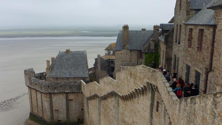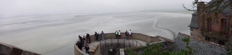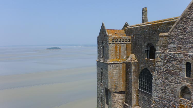Frente a la fachada de la iglesia abacial, ya en la parte alta del conjunto, se extiende una amplia terraza que es una atalaya sobrecogedora. Lo que desde aquí se observa es el resumen perfecto, y el regalo mayor, de la emoción que este lugar transmite. Esta bahía milagrosa, desplegada en todo su esplendor por el repliegue de las aguas, se pierde en una nebulosa lejana tras la que debe estar el mar. Pero este no se ve. En torno a los 960 metros de perímetro del monte la bajamar crea un paisaje extraño e hipnótico, con balsas de agua aquí y allá, una especie de húmedo desierto que debe ser uno de los mejores paseaderos del mundo. Como puntitos en una galaxia de arena, se observan en la distancia grupos de personas. Pero no hay que confiarse. Con la marea baja, se forman traicioneras charcas de arenas movedizas, y ya en 2013 un grupo de turistas atrapados en ellas hubo de ser rescatado. A ello hay que sumar la rapidez con que el flujo del océano progresa hacia la costa. De nuevo fue el autor de “Los miserables” quien lo expresó con exagerada pero certera metáfora al decir que las mareas avanzan aquí «a la velocidad de un caballo al galope». Lo cierto es que, según los especialistas, las aguas circulan por este lugar a 25-30 kilómetros por hora, es decir, si la atención está dispersa, una pleamar potencialmente peligrosa y homicida. Muchas fueron, en tiempos remotos, las vidas de peregrinos que encontraron por esta causa su tránsito al otro mundo…