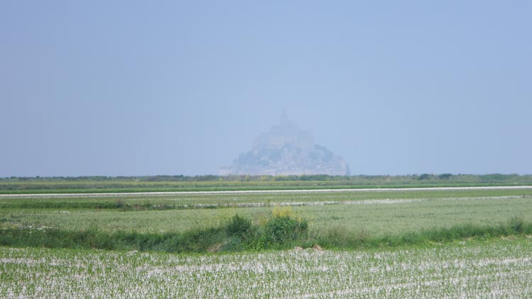 La enorme roca de granito aparece en la lejanía como un extraño ente flotante sobre la inmensa planicie verde. Sus contornos difusos se perfilan contra el lienzo de un cielo eterno que solo ella parece habitar. A medida que te vas acercando y ella se agranda, eres consciente de lo insólito de este lugar impensable: peñón o islote según la marea sea baja o alta, clavado en la arena en medio de una bahía grandiosa o habitante solitario del océano, respectivamente, su presencia se alza frente a la desembocadura del Couesnon, un río costero y manso cuyo estuario se funde con esa bahía formando un paisaje de atmósfera arrebatada. Llegamos en plena bajamar, y tenemos la fortuna de hacerlo en los últimos días de primavera, cuando la tribu turística aún no es masiva. Se cuentan historias terribles sobre el monte invadido de visitantes, con horas de espera para acceder, calles colapsadas y rampante estrés vacacional, pero poco de eso nos espera. En Francia, solo París y Versalles superan en poder de atracción al monte, visitado por unos tres millones de personas anualmente.