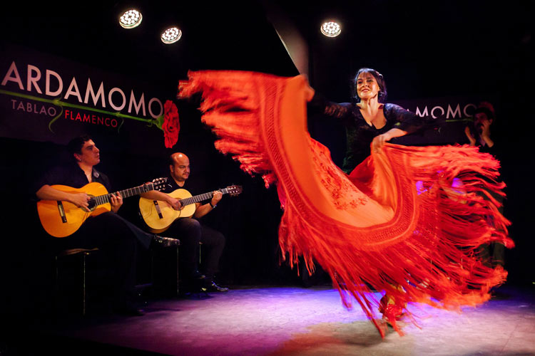 A un paso de la Puerta del Sol, de la Plaza de Santa Ana y la de las Cortes, se encuentra el tablao de Cardamomo donde maestros de la guitarra española y la percusión, prestigiosos cantaores y cantaoras, bailaores y bailaoras del flamenco se entregan al público en cuerpo y alma con un espectáculo en directo, único y singular. La íntima atmósfera del tablao anticipa al espectador la vibrante emoción que se va a experimentar al disfrutar en directo de un innovador espectáculo de flamenco, honesto y de raíz, en compañía de profesionales de prestigio. Punto de encuentro de los mejores artistas y estudiosos del flamenco, Cardamomo se ha convertido en símbolo del amor por este arte y en referencia reconocida por grandes como Joaquín Cortés, Enrique Morente, Estrella Morente, Jorge Pardo, Antonio Carmona, Ramón El Portugués, Tomatito o Raimundo Amador, entre otros. Tras la copa de bienvenida, 45 minutos antes del show, se ofrece servicio de cenas. Hasta hace poco Cardamomo celebraba sesiones infantiles con cuentos escenificados en las que más de una vez ha asistido la entonces princesa Letizia con sus hijas, sentadas en el suelo.