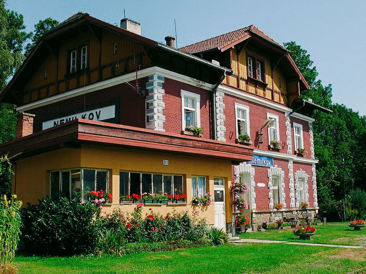 Rodeada de árboles, la estación de Nemilkov da la bienvenida al viajero como si fuese un impecable anfitrión con un hogar en perfecto orden de revista. La preciosa fachada de ladrillo rojo está adornada con losas decorativas blancas que rodean las ventanas, de cuyos alféizares asoman flores. Y esto ha sido así desde su origen, en 1888, cuando se decide conectar Bohemia del Oeste con Eslovaquia. Su aspecto, que hoy día puede sorprender, era el habitual en los edificios de esta localidad de la región de Pilsen. El conjunto acoge no sólo la sala de espera sino también un depósito de carga y habitaciones para los trabajadores de la estación.