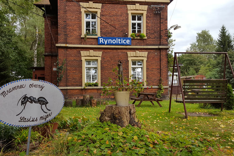 Si no fuese por el rótulo azul con el nombre sobreimpreso en blanco, pocos identificarían la de Rynoltice como una estación ferroviaria. Antes pensarías que es una vivienda, un hotel o una casa rural. Es tan encantadora, con su tejado a dos aguas, fachada de ladrillo rojo con elementos de madera, ventanales blancos y flores por doquier, que dan ganas de quedarse a vivir en ella. Su coquetería, unida a los elementos de confort, auparon su candidatura en el concurso de las mejores estaciones de tren hasta el primer puesto en 2013.