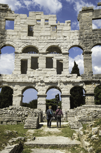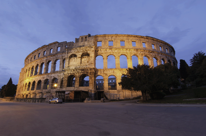 Esta ciudad de más de 3.000 años fue fundada por los primeros habitantes de Istria. En ella encontramos numerosos restos del paso de los romanos. El más importante o espectacular por sus dimensiones es el Anfiteatro, construido en la época de Augusto y Vespasiano. Este anfiteatro llegó a albergar a 20.000 personas y es uno de los mejores conservados. Su planta es elíptica y para su construcción se utilizó piedra caliza local. Tiene cuatro torres en las que antiguamente sobre su tejado habían cisternas de agua perfumada que espolvoreaban sobre el público. Hoy en día en él se organizan conciertos, festivales, óperas…Sus antiguos pasillos subterráneos ahora se utilizan como sala de exposición de objetos antiguos de tradición vinícola y de objetos antiguamente relacionados con el aceite.