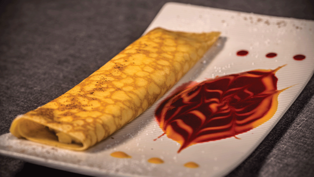 Los postres son singularísimos y gozosos, como la tarta de queso gallego con confitura de fruta de la pasión y mango o las famosas “filloas” rellenas de mouse de queso, identidad de la patria celta.