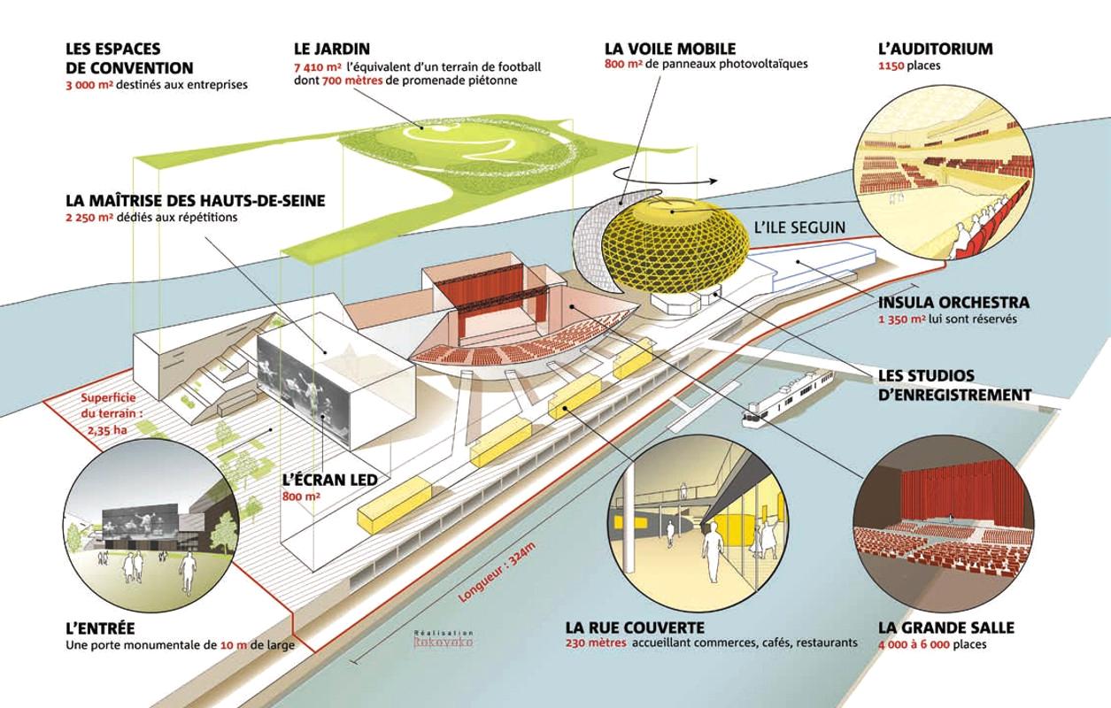 El arquitecto japonés Shigeru Ban y el francés Jean de Gastines han diseñado un revolucionario proyecto, sobre los antiguos terrenos que ocupaba una fábrica de Renault, que contempla una gigantesca bóveda de 800 metros cuadrados y destaca sobre el conjunto de edificios, permitiendo que desde el auditorio pueda contemplarse las vistas del Sena y sus alrededores. Todo el plan urbano de la isla ha sido diseñado por Jean Nouvel.