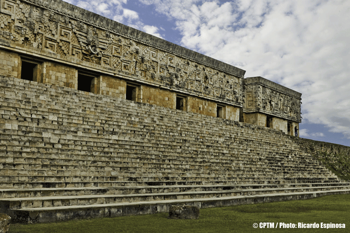 La arquitectura de estilo Puuc cuenta con intrincados tallados, mosaicos de diseños geométricos tallados en piedra y máscaras del Chaac. Estos detalles pueden ser apreciados a lo largo de las ruinas de Uxmal y pueden ser admirados mejor en el Cuadrángulo de las Monjas y en la ornamentada fachada del Palacio del Gobernador. Y para finalizar sube a la cima la Gran Pirámide; puedes obtener unas preciosas vistas panorámicas que te dejarán sin respiración.