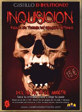 Los días 16,17 y 18 de agosto, de 22.00 horas a 03.30 horas, el Castillo de Belmonte abrirá sus puertas de forma nocturna para llevar a cabo un nuevo espectáculo de terror, en formato histórico: la Inquisición. Recorre sus pasillos en tinieblas y aprende qué fue de sus personajes.