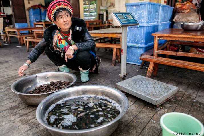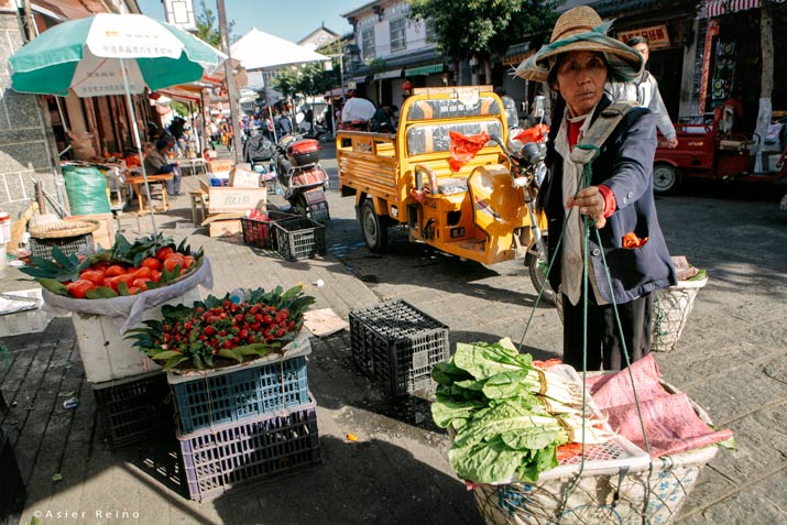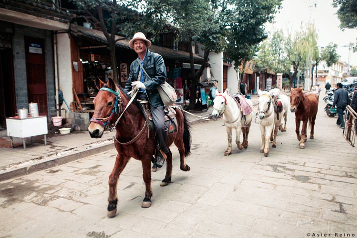 Por eso, para poder tener una visión más auténtica de la verdadera esencia bai, es recomendable buscarla en las aldeas circundantes, cuanto más alejadas mejor o, incluso, en otra localidad de cierto renombre como Shaxi, a un par de horas de carretera al noroeste, que aguanta estoicamente, casi intacta, como uno de los pocos vestigios vivos de la antigua y romántica Ruta de los Caballos y el Té. Un lugar precioso, que se ha protegido de la masificación turística y que conserva su patrimonio intacto, por estar alejado de las típicas rutas. Allí se puede dejar volar la mente imaginando cómo serían en el pasado los días de mercado, en una mezcla de vestimentas occidentales y túnicas del color azafrán de los monjes tibetanos, al olor de las especias, con una continua y susurrante cacofonía de idiomas, producida por el relajado pero incesante intercambio entre mercaderes llegados de todas la partes del mundo. Comerciantes y animales que tenían miles de kilómetros por delante hacían escala en ese precioso pueblo bai, que se convirtió en uno de los mercados principales de la ruta. El pu’er, el azúcar y la sal, procedentes del este, se intercambiaban por productos frescos producidos por los bai y los «yi», que los llevaban a Shaxi desde las pequeñas aldeas de los alrededores, en carromatos tirados por mulas.