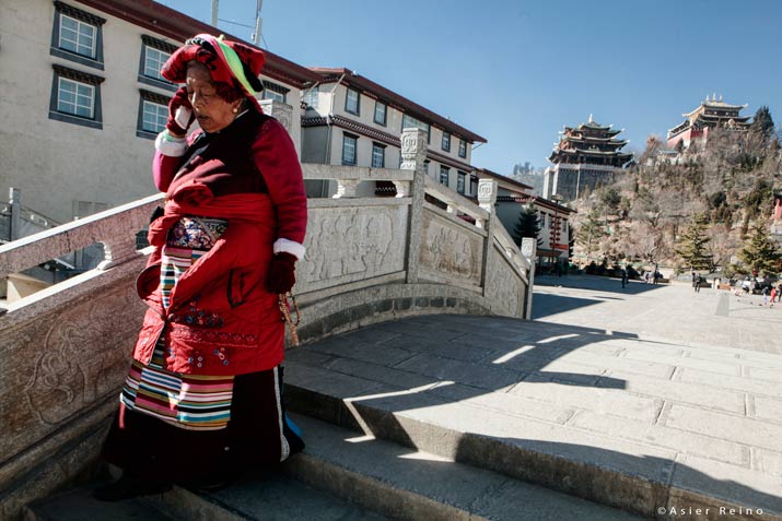 También fundamental en el territorio de Yunnan es la etnia tibetana, que se concentra en el extremo noroccidental de la provincia, junto a la región autónoma del Tíbet. Acceder hasta ellos bordeando la vera del río Yangtse, a más de tres mil metros de altitud, por sinuosas carreteras sin protección alguna, es una de esas experiencias que no se olvidan en toda una vida. Sobre todo si la ruta incluye la Garganta del Salto del Tigre, uno de los barrancos más profundos de la Tierra en el que, el potente amarillo y la brutal fuerza del río Yangtsé, en su camino desde el Himalaya hasta el Delta del Mekong, visto desde las alturas, forman un conjunto realmente estremecedor. El frenético trazado por esa cadena de montañas conduce, en sentido norte, hacia las brillantes luces de los llanos tibetanos que rodean Zhongdian, la conocida como Shangri-la, desde que en 1933 el escritor británico James Hilton, en su novela Horizontes Perdidos, describiera un curioso pueblo, enclavado a las puertas del Tíbet, que era una especie de paraíso terrenal en el que, entre otras cosas, sus habitantes no envejecían.